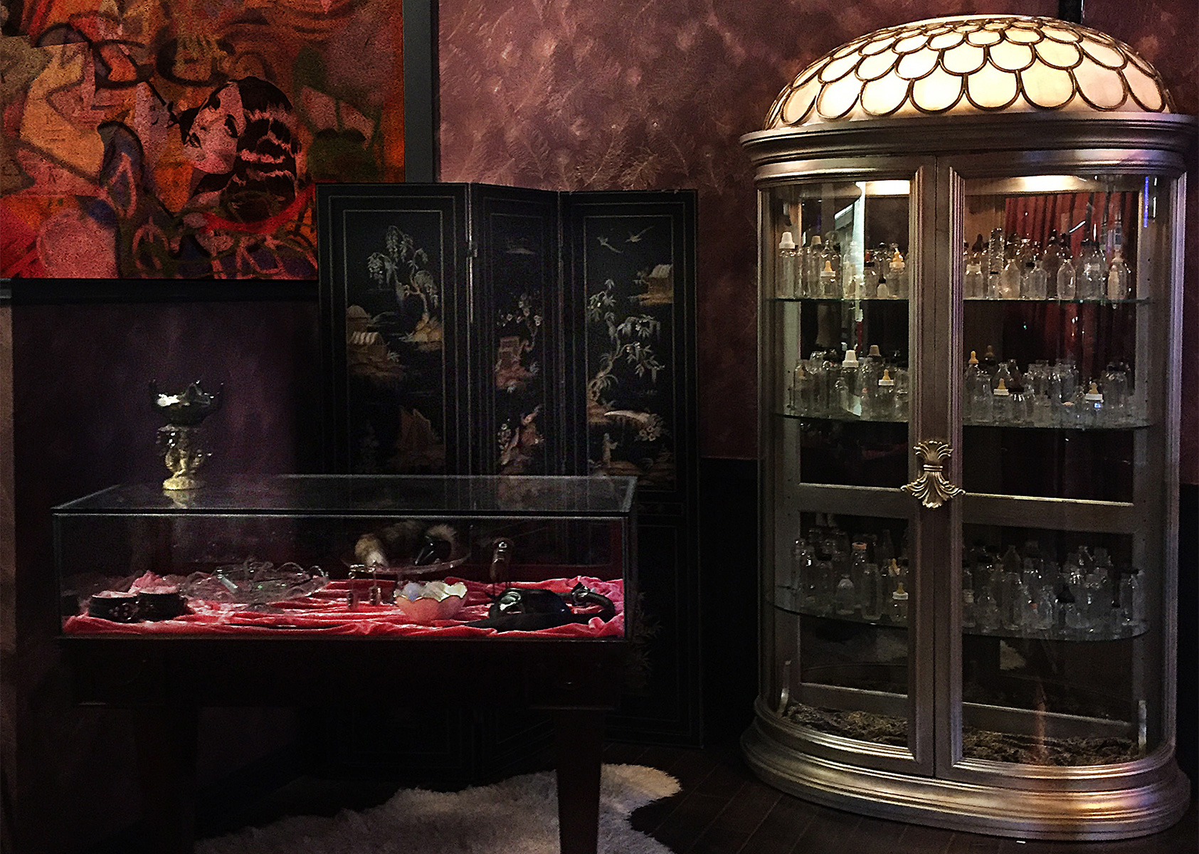 The restaurant is hidden behind a neon sex shop facade with a reception space akin to a vintage bordello; a reception desk fashioned from an antique display case full of 'exotic' toys and a vintage cabinet displaying a collection of antique glass baby bottles!